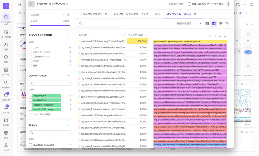 スタックトレースインサイトは、単一のエラー分析から大量データの集計分析まで対応します。個別の遅延リクエストを分析する場合は個々のスタックを確認し、全体的な性能傾向を把握する場合はSFRチャートを活用します。スタックトレースレコーダー(Stacktrace Recorder)は、数百のスタックトレースを1つのチャートとして集約し、どの関数で処理時間が消費されているのかを可視化します。実運用環境で繰り返し発生するボトルネックを迅速に発見するうえで、特に効果的です。