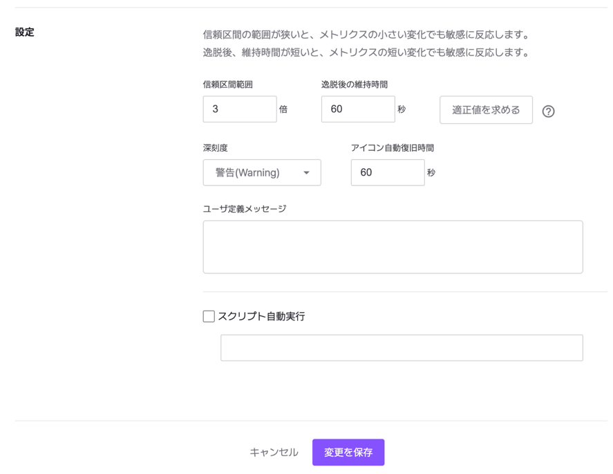 異常イベントは過去のデータパターンを学習し、正常な範囲を自動的に設定します。通常とは異なる変動が発生した場合に自動で通知を行うため、異常の早期発見が可能になります。また、複数のメトリクスへ一括適用できるため、設定作業の負担を大幅に軽減します。