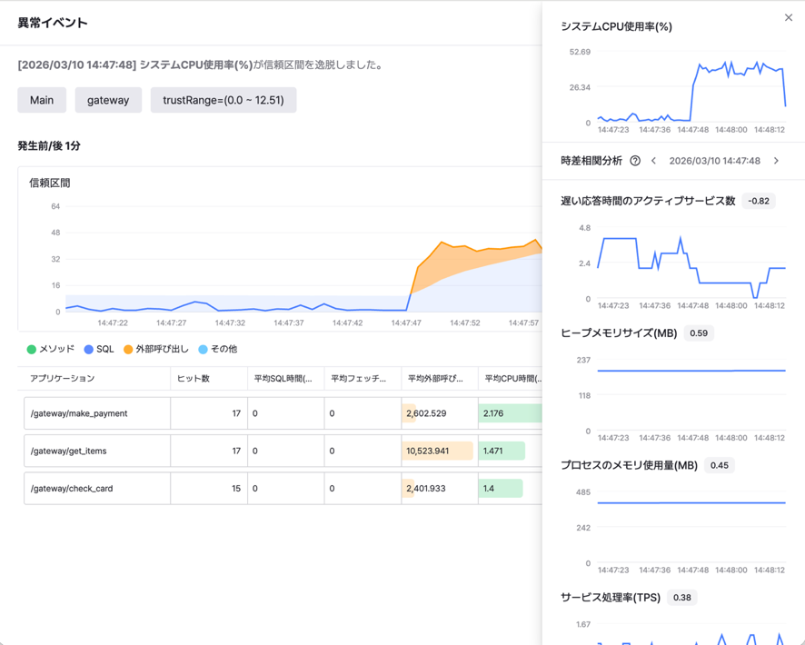 更に一歩進み、時間差相関分析(Lag Correlation Analysis)にも対応しています。トラフィックの増加が先に発生し、その後CPU使用率が上昇し、最終的に応答速度が低下するといったように、時間差を伴って伝播する障害の流れも追跡できます。