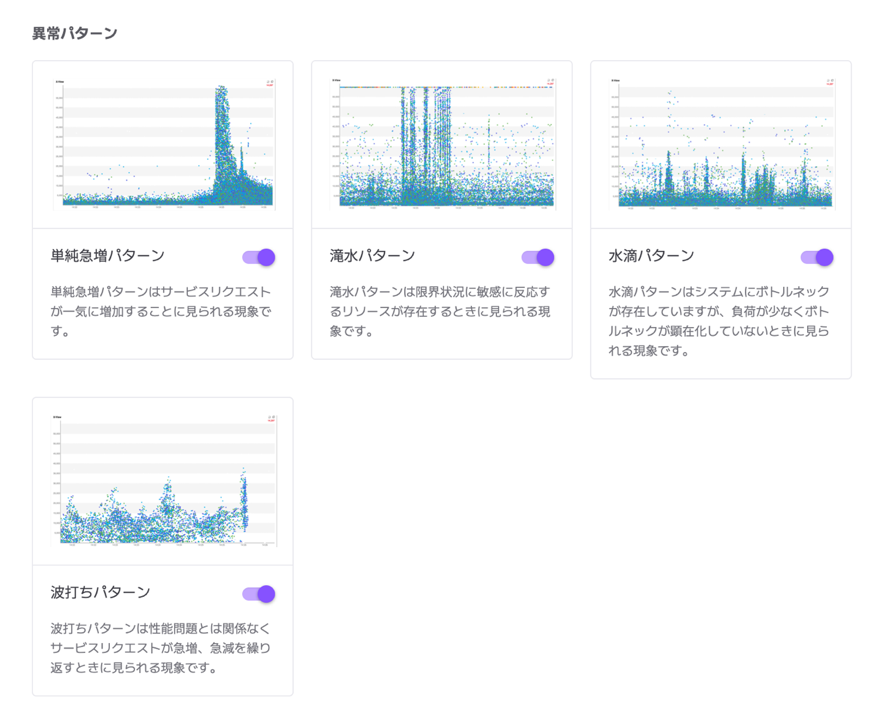 このようにX-Viewは非常に強力なモニタリングツールですが、散布図の形状をシステムの状況と結び付けて解釈することに慣れていない場合、理解し難いこともあります。X-Viewパターン認識は、チャートをリアルタイムで分析し、「ウェーブ(波打ち)パターン」や「ウォーターフォール(滝水)パターン」といった障害特有の傾向を自動的に検出します。例えば、波打ちパターンが検出された場合、「トラフィック増加に伴い応答時間が不安定になっている」といった分析結果を提示します。