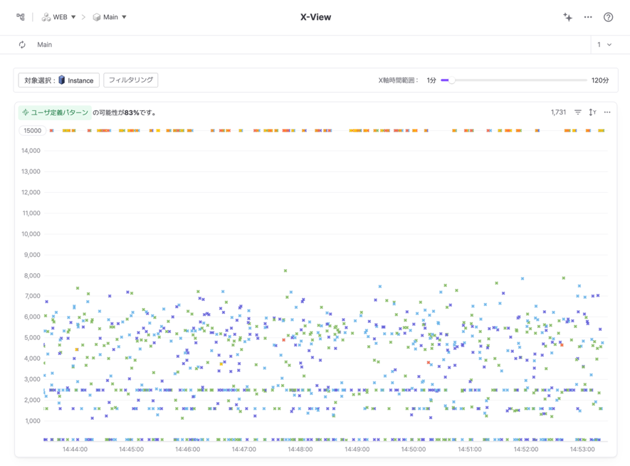 X-Viewは、JENNIFERにおけるトランザクション分析の中核機能であり、ユーザーからのリクエスト1件を1つの点として表示します。X軸はリクエストの完了時刻、Y軸は各リクエストの処理時間を表します。チャートの上部に点が多く分布している場合は、応答遅延のトランザクションが多く、パフォーマンスの改善が必要であることを示します。一方、下部に点が集中していれば、多くのリクエストが高速に処理されており、システムが安定して稼働している状態と判断できます。