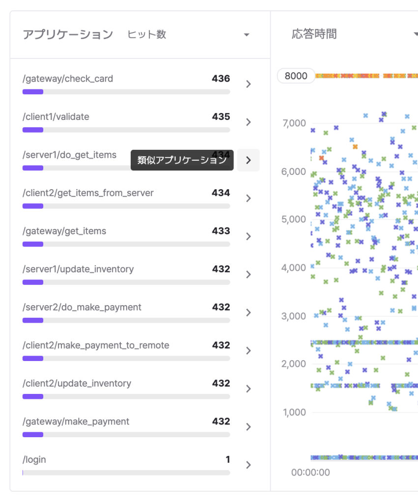 近年、多くのシステムがマイクロサービスアーキテクチャで構成され、1つの機能を実現するために複数のサービスが連携しています。そのため、あるサービスで問題が発生すると、関連する他のサービスへ連鎖的に影響が及ぶことがあります。類似アプリケーション検索を活用すれば、数十のサービスを個別に確認することなく、障害の影響範囲を迅速に把握し、原因追跡を効率的に行うことができます。