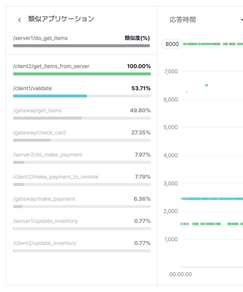 同じフューショットラーニングモデルを拡張し、類似アプリケーション検索にも対応しています。X-Viewパターン認識が「現在のチャートが特定の障害パターンとどれだけ似ているか」を評価するのに対し、類似アプリケーション検索では「2つのアプリケーションのX-Viewパターンがどれだけ似ているか」を分析します。